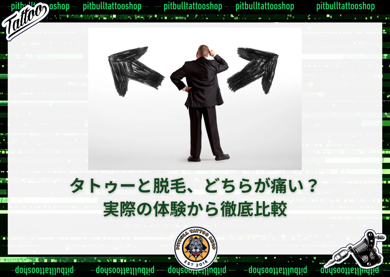 タトゥーや医療脱毛・エステ脱毛を経験したことがある人なら、一度は「どちらの方が痛いのだろう?」と考えたことがあるかもしれません。どちらも皮膚に刺激を与える施術であるため、痛みが伴うのは共通点ですが、痛みの種類や強さには大きな違いがあります。ここでは、タトゥーと脱毛の痛みを比較しながら、その特徴を詳しくご紹介します。