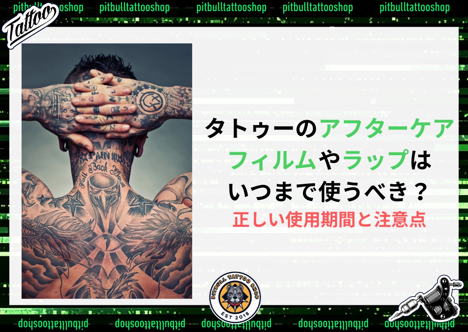 タトゥーを入れた後に欠かせないのが「アフターケア」です。その中でも、施術直後に使用する フィルムやラップ は、細菌感染や摩擦から肌を守る重要な役割を果たします。しかし「どのくらいの期間つけていれば良いのか」「長く使うと逆に悪いのか」と悩む方も多いはずです。ここでは、タトゥーアフターケアにおけるフィルムやラップの使用期間と正しい扱い方について詳しく解説します。