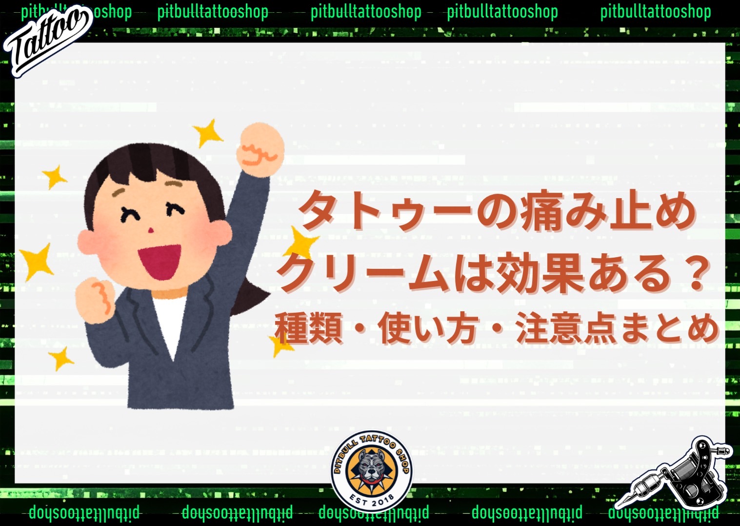 タトゥーを入れるとき、多くの人が最も不安に感じるのが「痛み」です。部位やデザインの大きさによっては、長時間にわたる強い痛みを伴うこともあり、「少しでも楽に施術を受けたい」と思う方は少なくありません。そんなときに役立つのが痛み止めクリーム(麻酔クリーム)です。この記事では、タトゥーに使える痛み止めクリームの種類や効果的な使い方、注意点を詳しく解説します。